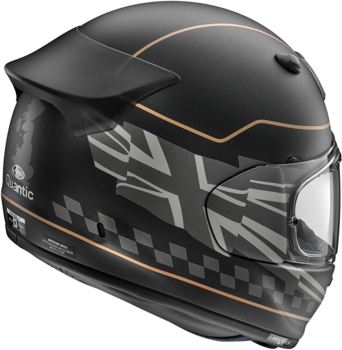 Quantic Ventilation - Comprehensive and controllable ventilation is based around 12 ventilation ports: 6 intake, 6 exhaust. The 3D Arai logo feeds cooling air into two central intake points and works well at low speed, alongside dual F1-derived tear duct top intakes, twin brow vents and 2-position sliding air-scoop, filtered chin vent. Hot air is efficiently extracted via the 3-way one-piece rear exhaust/spoiler, twin flush-fit side exhausts (with foam dams to reduce noise) and neck exhaust.