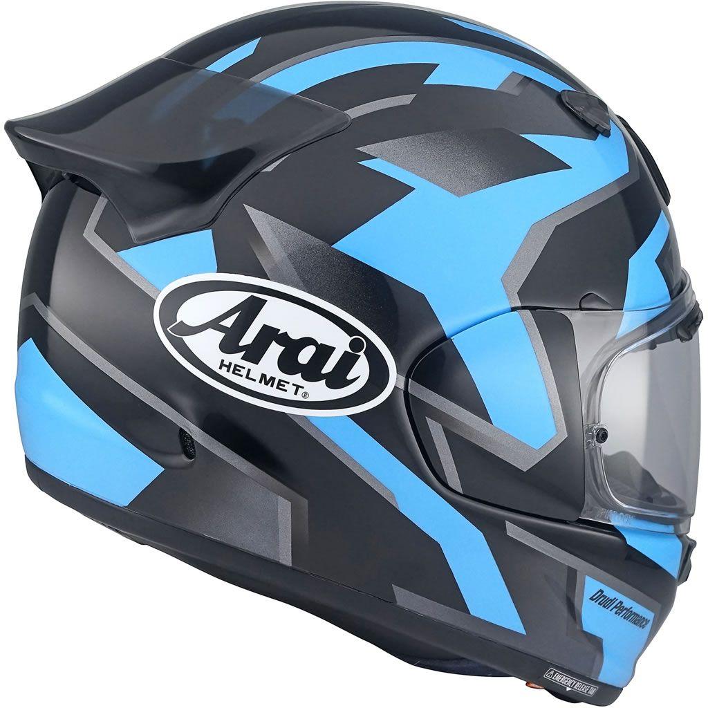 Quantic Ventilation - Comprehensive and controllable ventilation is based around 12 ventilation ports: 6 intake, 6 exhaust. The 3D Arai logo feeds cooling air into two central intake points and works well at low speed, alongside dual F1-derived tear duct top intakes, twin brow vents and 2-position sliding air-scoop, filtered chin vent. Hot air is efficiently extracted via the 3-way one-piece rear exhaust/spoiler, twin flush-fit side exhausts (with foam dams to reduce noise) and neck exhaust.