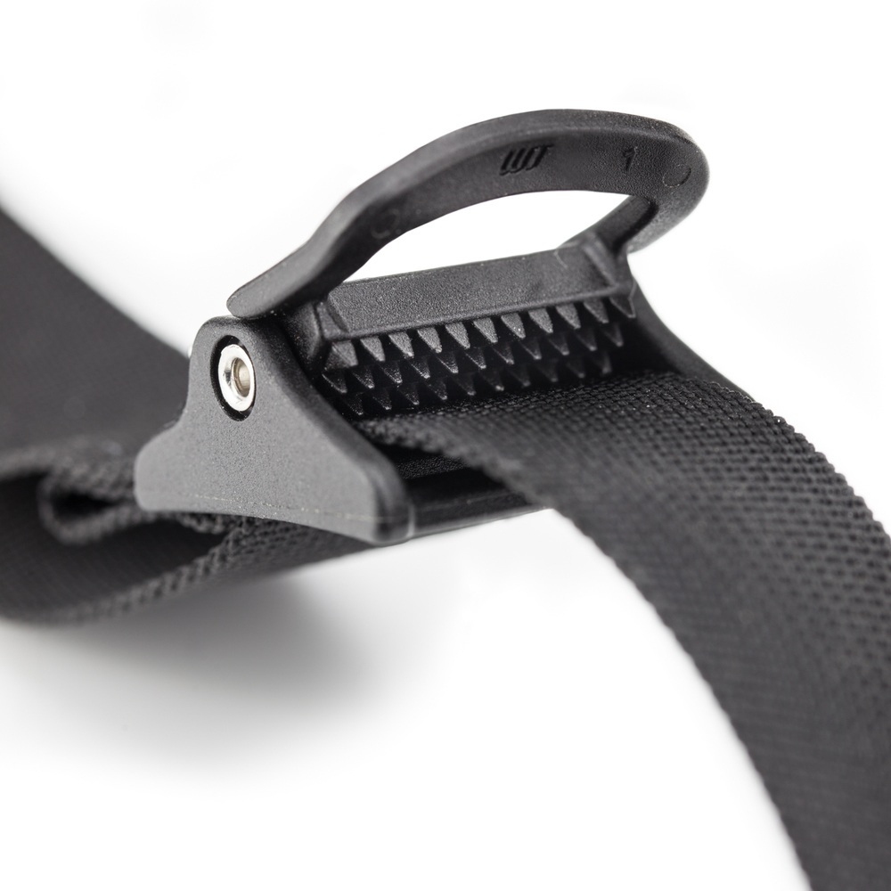 Moulded Acetal buckles with ultra-agressive grip-spikes on cam for non-slip web, even with heavy loads and wet straps.