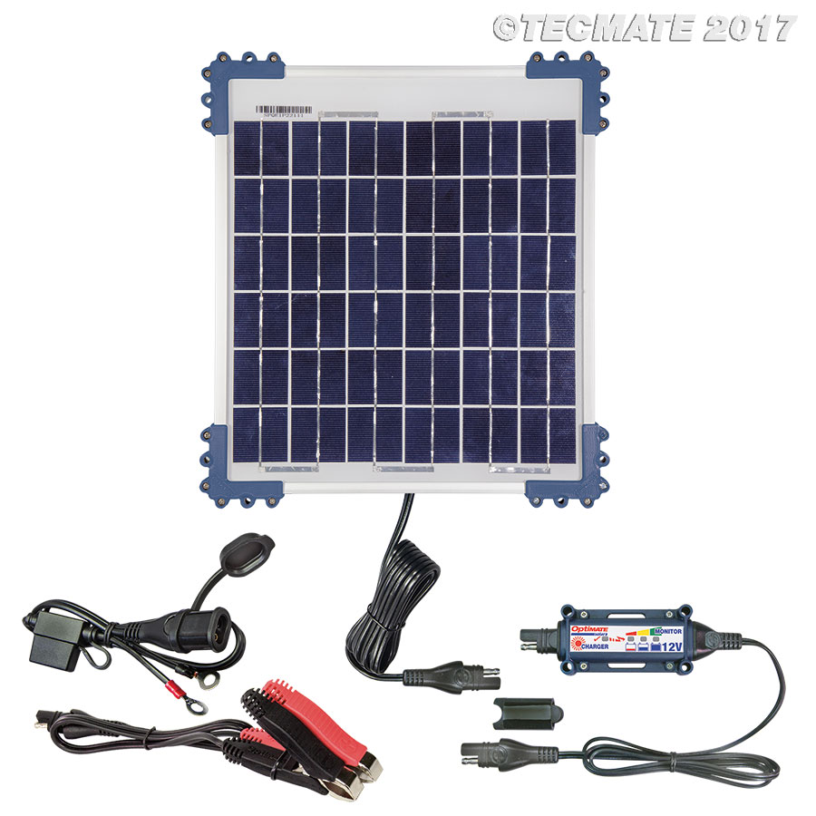The smart OptiMate Solar system includes a 10 Watt weatherproof solar panel and a smart OptiMate Solar combination charger-monitor controller, that charges & maintains a 12V battery during the day and monitors and displays the battery state of charge at night.