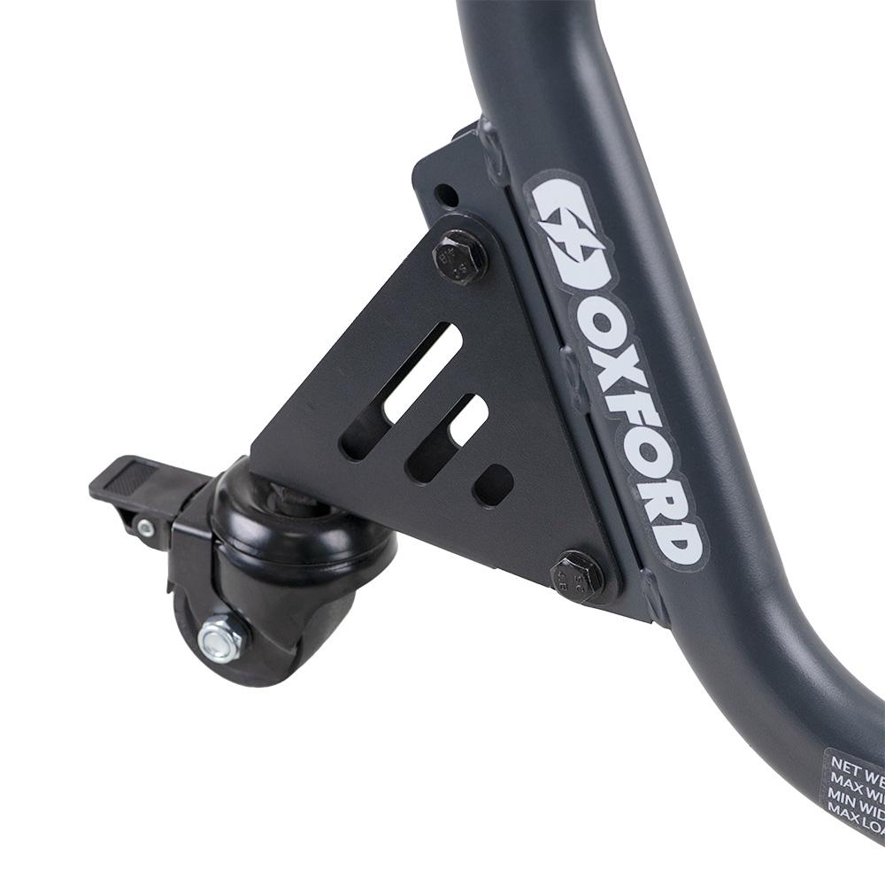 The castor wheels on this Oxford paddock stand mean I can spin the bike 180 degrees if need be and manoeuvre it into the space against the wall where it can be safe from falling objects or heavy garage items dragged past its easy-to-scratch paint.