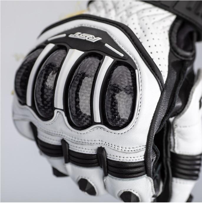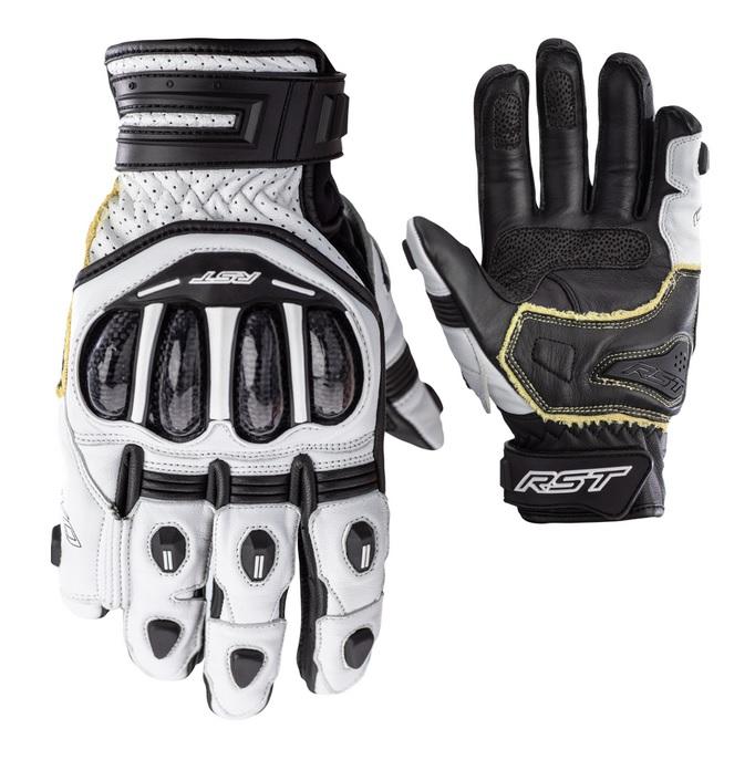 Made with both full-grain cowhide and kangaroo leather, the glove features a CE Level 1 Carbon Knuckle Protector for impact protection. DuPont™ Kevlar® Fibre on the palm stitching and underlay, along with double layer kangaroo leather and an RST palm slider protect the palm in the event of a high speed slide. Elasticated conjoined fingers to prevent “finger roll” without affecting reach or flexibility when changing gear and the hook & loop closure offers a secure fit.